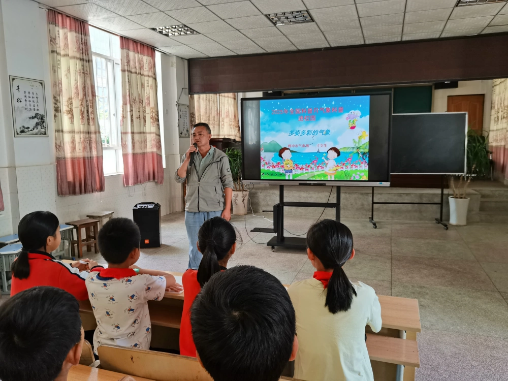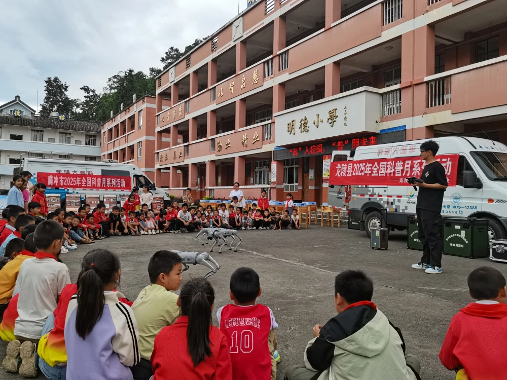 当日清晨,两辆满载科普教具的蓝色大篷车先后抵达校园。车身刚停稳,学生们便好奇地围拢过来——机械狗灵活的翻身动作、仿生机器人模仿人类行走的憨态、无人机在操场上空划出的优美弧线,瞬间点燃了校园的科技热情。腾冲市气象局专家带来的《天气探秘》互动课堂成为首个爆点,通过模拟暴雨预警系统操作、极端天气VR体验等环节,孩子们在惊叫与欢笑中理解了气象科学的现实意义。“原来云层里的水滴要这么重才会下雨!”弄岭小学四年级学生王雨桐盯着模拟降水装置,眼睛里闪烁着求知的光芒。