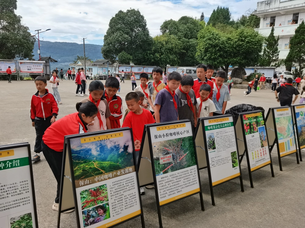校园走廊里,40余块科普展板构成流动的知识长廊。“保山咖啡知识”展区用种子萌发到咖啡冲泡的全流程图解,让学生惊叹于家乡特产背后的科技含量;“中华民族共同体”主题展板则通过腾冲市特有的民族风情、丰富的旅游资源等案例,展现各民族共铸的科学智慧。午休时分,仍有学生驻足展板前,用笔记本抄写着感兴趣的知识点。