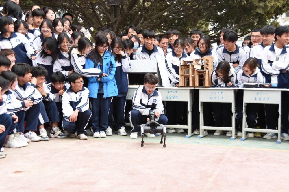 活动现场分为动态展演区和静态体验区两大板块。在动态展演区,机器人舞蹈队伴随着流行音乐的节奏,完成了一系列复杂而精准的动作;机器狗则展示了小跑、作揖、俯卧撑搬运等实用技能,其灵敏的反应和强大的环境适应能力令同学们惊叹不已。