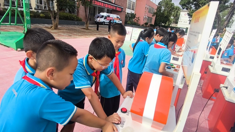 9月23日上午,科普大篷车走进芒市第七小学,活动中,各县(市)科协精心准备的特色互动展具,不仅数量众多,更以贴近生活、新奇有趣的特点深深吸引广大青少年驻足体验。例如,机器狗互动区带来了能够对话、跳舞的智能机器狗;物理探究区展出了光学转盘、电磁效应装置、新能源模型等;生态环保主题区则通过可视化的水质监测、垃圾分类互动游戏等,让学生们在亲手操作和观察中理解科学原理。通过“做中学、学中做”的方式,不仅激发了对科学的好奇心与探索欲,也锻炼了观察、思考和解决实际问题的能力。