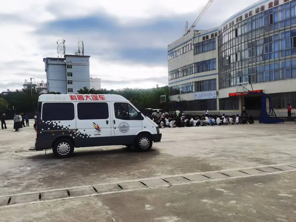 活动现场洋溢着孩子们的欢声笑语。活动通过展览展示科普大篷车车载资源设备,四足机器人表演等方式。随着指令,机器狗灵活做出打滚、转圈、跳舞等动作,每变换一个姿势,现场就响起一阵欢呼。机器人展演,学生们忍不住轻轻伸手触摸、凑近仔细观察,近距离感受科技带来的神奇魅力;安全科普区,设置了消防器械展示区与四大主题展板,涵盖消防、防溺水、道路交通安全、食品安全、反邪教内容。其中反邪宣传展通过生动案例,帮助学生清晰认清邪教危害,筑牢安全思想防线。