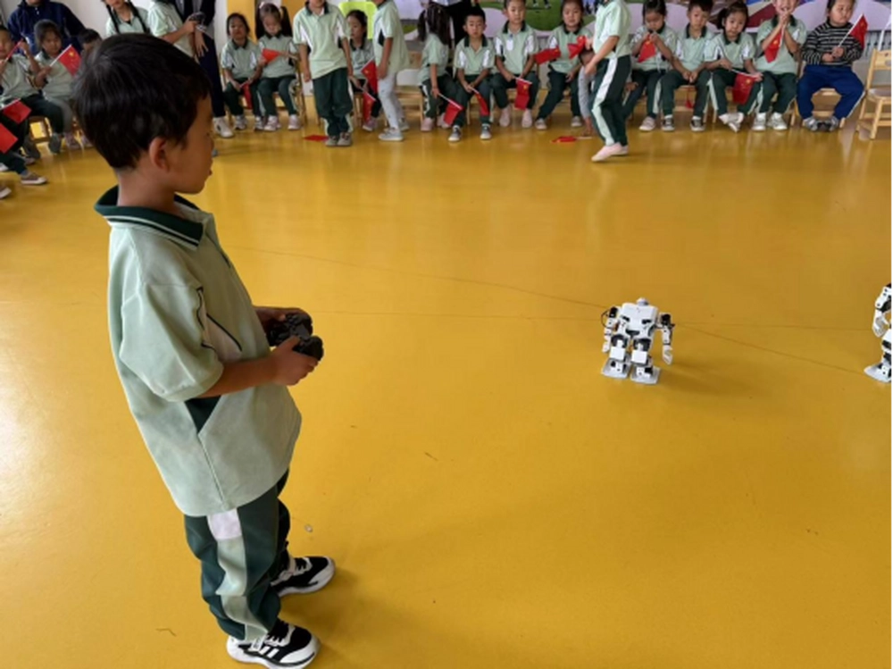互动环节里,孩子们变身“小小驯兽师”,在老师保护下与机器狗近距离互动。小手轻触、指令被回应的瞬间,他们脸上满是对科技的好奇,更藏着对祖国科技的懵懂骄傲——这份童真自豪,便是献给国庆最纯粹的“童心贺礼”。