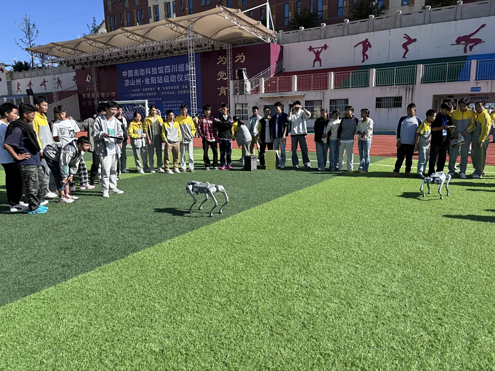 活动现场,学生们围绕科普大篷车踊跃参与,成为校园里最热闹的“科学乐园”。智能机器狗、机器人伴随音乐完成跳跃、倒立等动作,引发学生阵阵欢呼;“干冰实验秀” 上,科普辅导员将干冰倒入水中,瞬间升腾的 “白雾” 让学生们好奇地围拢观察,在提问与解答中了解 “升华” 物理现象;益智游戏、光的反射、声的传播等互动实验项目更是充分调动学生的动手能力,让他们流连忘返。现场参与的师生纷纷表示,活动打破了地域限制,让偏远彝区的孩子得以近距离接触前沿科技,真切感受到科学的乐趣。