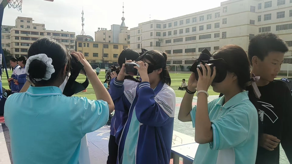 “粉尘爆炸”“火焰掌”等科普小实验带来了有趣又实用的科学知识。粉尘与空气充分混合后,遇到明火就可能引发爆炸;火焰掌利用易燃气体丁烷产生火焰,以手掌中的水保护手而免受伤害,同学们在亲身体会中探秘科学的神奇,感受科学带来的快乐。VR主题眼镜构建虚拟科幻场景、非遗拓印融合科学与传统文化,碰撞出科普的火花。