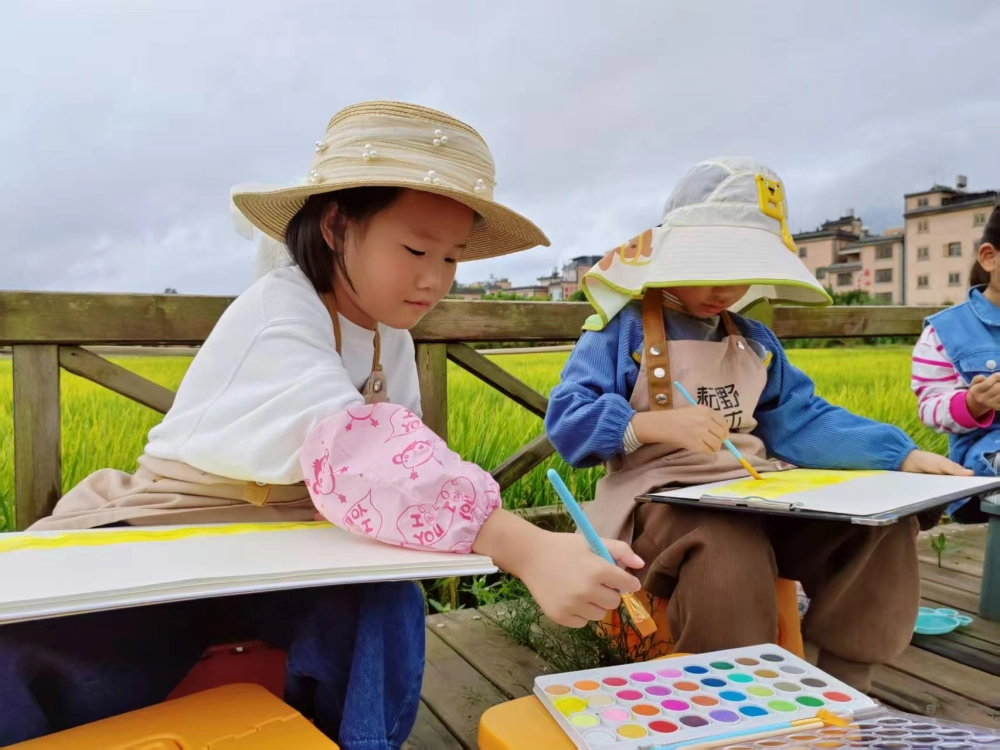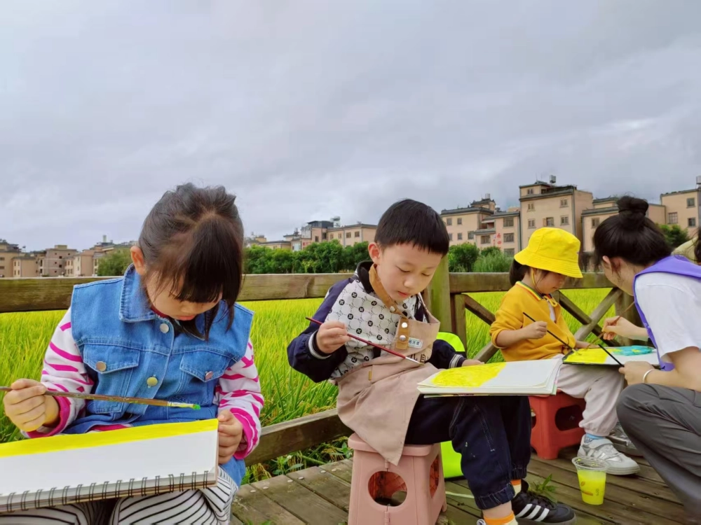 当天的稻田,像是被大自然打翻的调色盘,沉甸甸的稻穗压弯了稻秆,丰收的喜悦扑面而来。孩子们踩着田埂上的青草,手里攥着画笔和画本,眼睛里满是好奇与兴奋。有的蹲在田边,小心翼翼地观察稻穗的纹路;有的轻轻抚摸稻芒,感受那细微的刺感;还有的趴在画板前,一笔一划地将眼前的丰收景象定格:金黄的稻穗、湛蓝的天空、田埂边的野花,都在孩子们的画笔下变得鲜活起来,稚嫩的笔触里满是对自然的热爱。