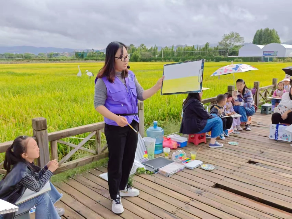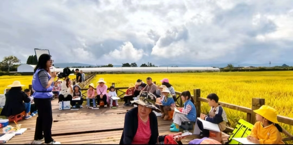 金秋送爽,稻浪飘香。在全国科普月与祖国76华诞到来之际,为激发少年儿童热爱祖国、学习科学家精神,引导他们亲近自然、热爱科学、参与生态保护,9月27日,澄江市科协联合耘野艺术,在马房村东侧的稻田里开展了一场别开生面的“去稻田里约‘绘’ ”———稻田里的科普课。让孩子们在金色田野间,沉浸式感受丰收之美与科学之趣。