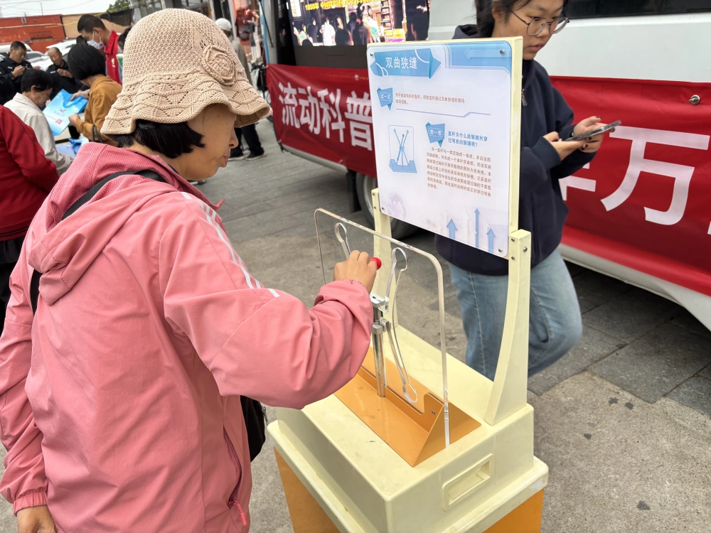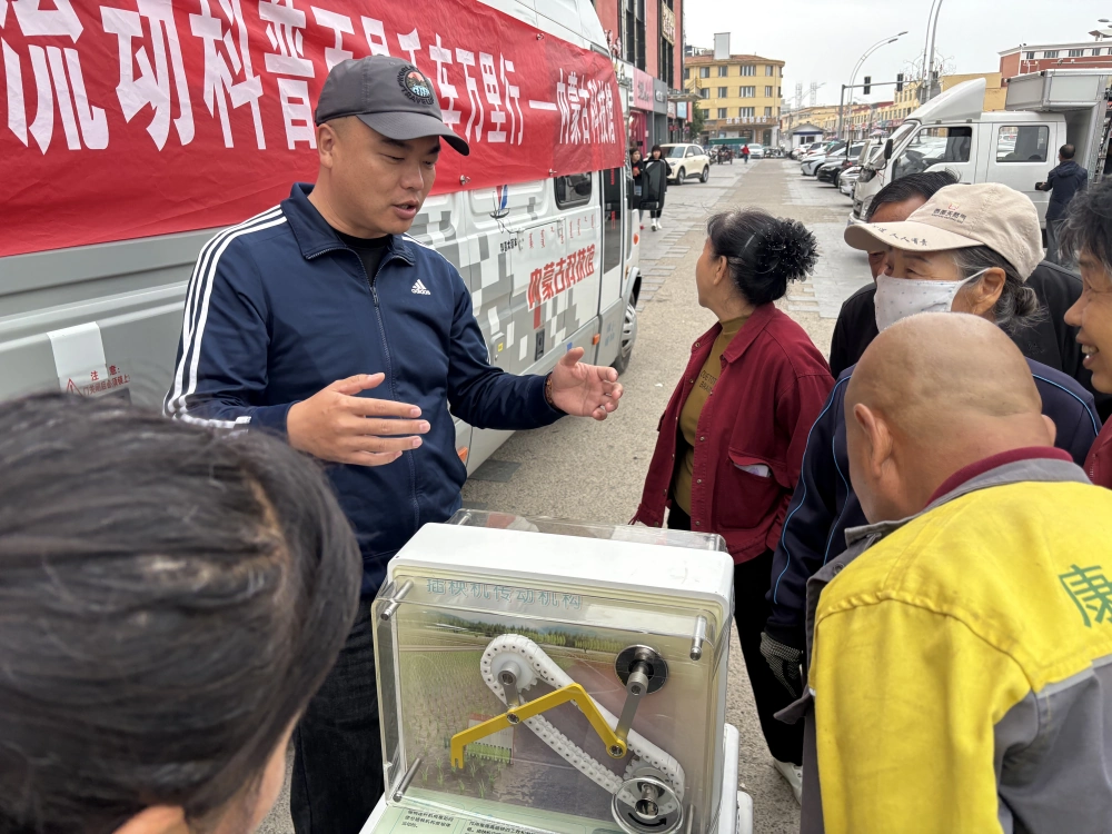 在广场中央,科普大篷车满载着集物理、生活、农业原理的科普展品,为群众展示了“插秧机传动机构”“双曲狭缝”等展品的科学原理,这场科普之旅,就像一场奇妙的科技派对,把知识变成看得见、摸得着的快乐,在群众的心里悄悄种下探索科学的种子。