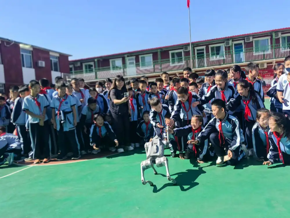 最让人期待的四足机器人表演登场时,现场气氛直接推向高潮。伴随着欢快的音乐,机器人迈着灵活的步伐走上“舞台”,时而跳跃、时而转圈,还会跟着节奏“点头”互动。孩子们瞬间围得水泄不通,有的踮起脚尖、有的举着手机记录,还有低年级的小朋友忍不住伸出手,想和这个“钢铁小伙伴”握握手。“它太可爱了!我以后也要制作一个会跳舞的机器人!”三年级学生激动地说,眼里闪烁着对科技的向往。