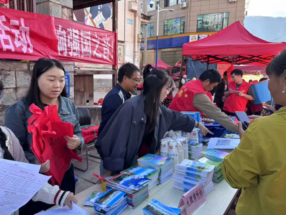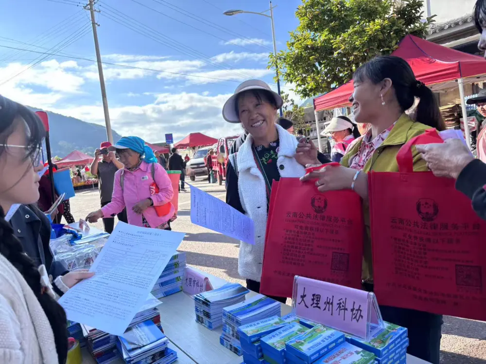 活动现场,红色帐篷下,大理州科协、大理市科协等多个展位前人头攒动。工作人员们热情地向乡亲们递上科普手册,这些手册涵盖了多个领域。大理州科协的展位上,印有“云南公共法律服务平台”的红色环保袋深受大家喜爱,乡亲们拿着袋子,认真聆听工作人员讲解医保的小知识。大理市科协和云龙县科协的志愿者们则忙着为大家答疑解惑,从科学种植到防灾减灾,耐心细致的讲解让乡亲们频频点头。