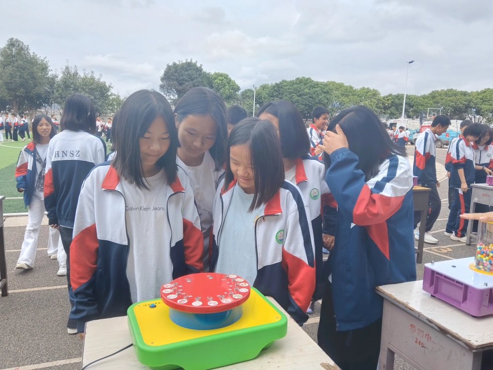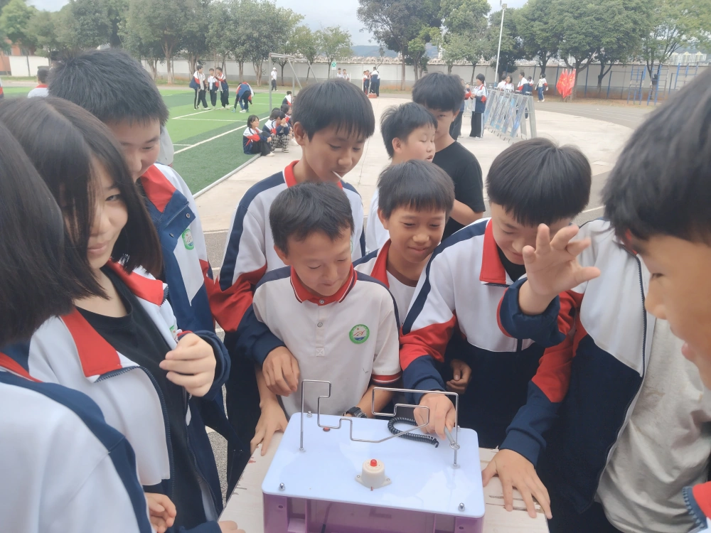 通海县科普大篷车在宁泉中学、宁阳中学,分别展出车载科普展教具14件,科学仪器聚益智与趣味、科学为一体,各年级的学生们三五成群地围在共振鼓、人体发电、永动机、猜属相、魔镜、魔厢、魔具、时光隧道、看得见的声音、袋鼠下坡等器具前快乐体验,人机互动中打开了眼界,增长了见识,小声议论——原来科学就在身边,生物、物理、化学、数学交织其中,神妙又好玩。
