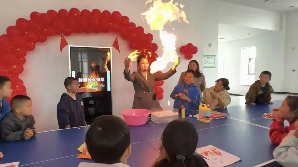 如果说拼贴环节是“用创造表达热爱”,那“神奇火焰掌”实验便是“用探索触摸科学”。面对“手上能点火”的实验,孩子们起初既好奇又胆怯地往后退,工作人员并未直接催促,而是化身“安全助手”:先引导孩子在手上形成水膜,边操作边解释“这是保护手的‘保护膜’,能隔绝火焰、避免烫伤”;示范时还特意抬高手掌,让每个孩子看清“火苗只在泡泡上跳跃,不会烧到皮肤”。当第一个孩子在护持下看着掌心燃起火焰,惊喜喊出“真的不疼!”后,更多孩子主动举手参与——他们或小心翼翼观察火焰,或兴奋举着手转圈,体验结束后还围在一起讨论“为什么火苗不烫”“溶液里藏着什么秘密”,科学的种子就在这主动探索的好奇中悄悄发了芽。