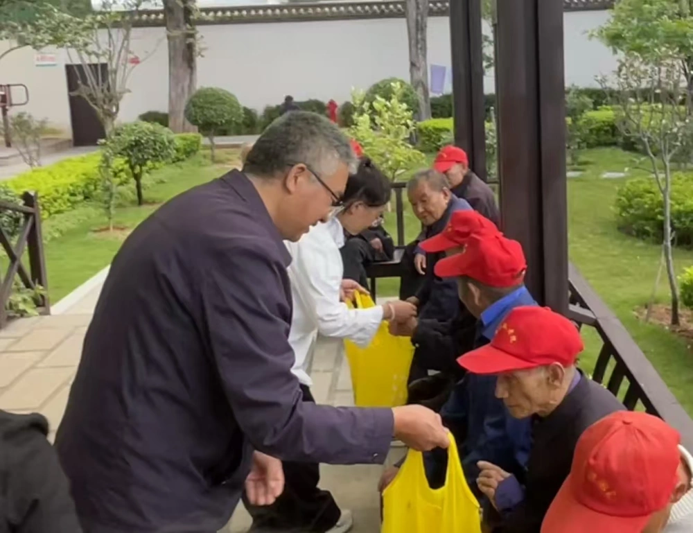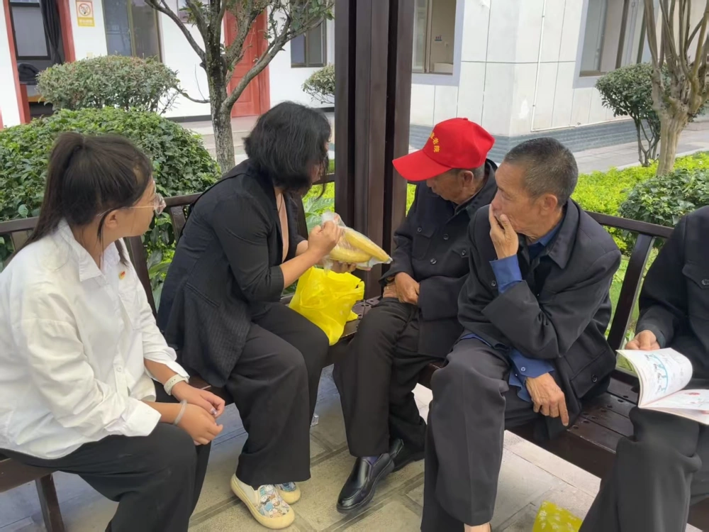 宣誓结束后,党员们为敬老院31位老人及7名工作人员送上了精心准备的慰问品,包括新鲜水果、营养牛奶、可口面包等贴心食品,也有日常需求的实用雨伞和被褥,更包含专为老年群体准备的健康教育知识读本。每一份物品都承载着对老人们生活的关切与对工作人员辛劳的敬意。