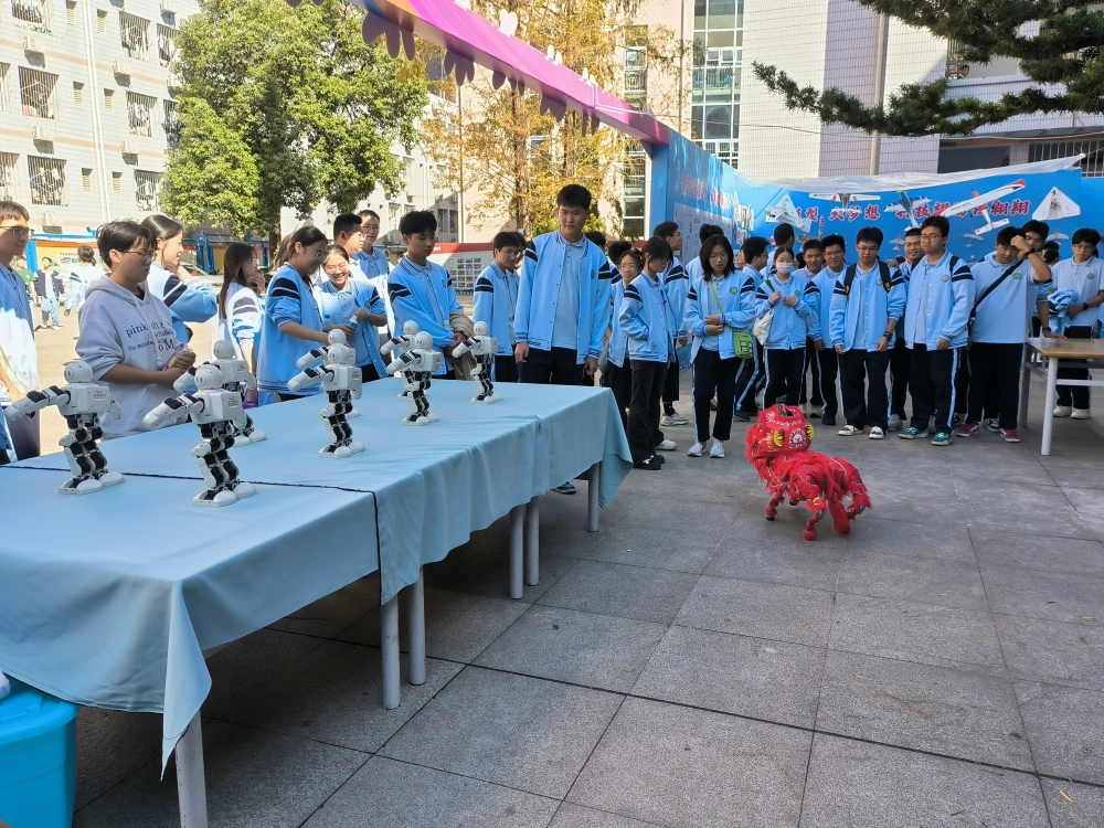 活动现场,最吸引眼球的莫过于多才多艺的机器人。伴随着动感的音乐,一排排灵活的跳舞机器人整齐划一地舞动,动作精准又带着几分俏皮,引得围观师生阵阵喝彩。紧随其后的机器狗也不甘示弱,不仅能跑能跳,还能完成站立、作揖等高难度动作,憨态可掬的模样瞬间成为“团宠”。一场精彩的科学体验秀更是将气氛推向高潮,老师们通过一个个有趣又神奇的实验,将深奥的科学原理化为直观的视觉盛宴,让大家在惊呼与笑声中感受科学的魅力。