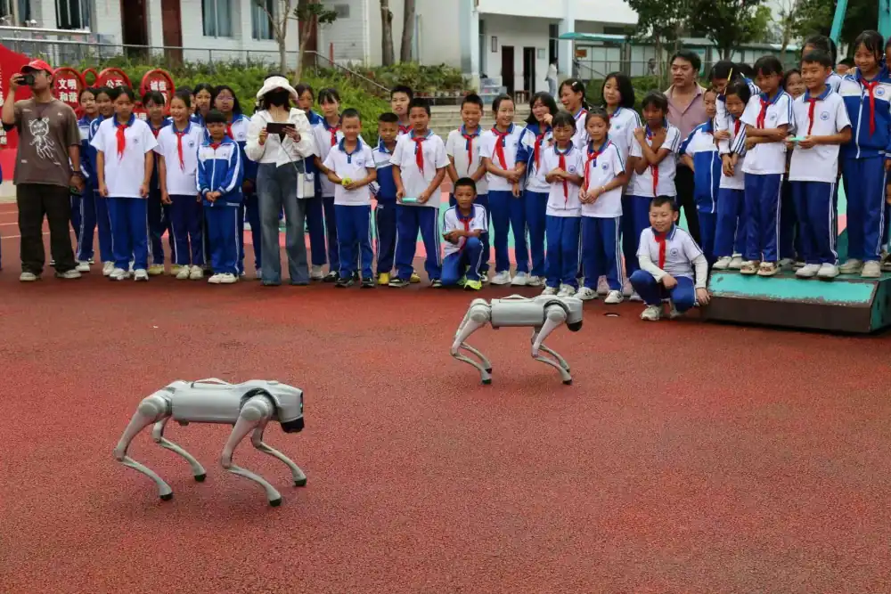 科技制作小课堂结束后,活动现场迎来了高潮--机器狗表演。随着指导员的指令,两只通体银色、外形灵动的机器狗迈着稳健的步伐走上表演区,瞬间吸引了全场师生的目光。