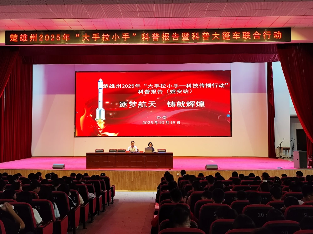 为激发青少年科学兴趣,2025年10月15日,楚雄州2025年“大手拉小手”科普报告暨科普大篷车联合行动在姚安一中和大成中学同时开展,为师生们带来一场精彩纷呈的科普知识盛宴,在校园里掀起探索科学奥秘的热潮。