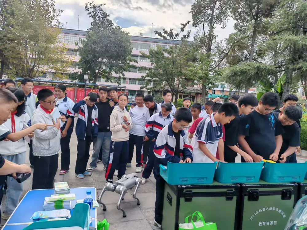 在大成中学的科普大篷车巡展现场,机械狗等前沿科技展品吸引学生们驻足探索,大家在动手操作中直观感受科技的神奇,在互动体验中激发科学探究的热情。