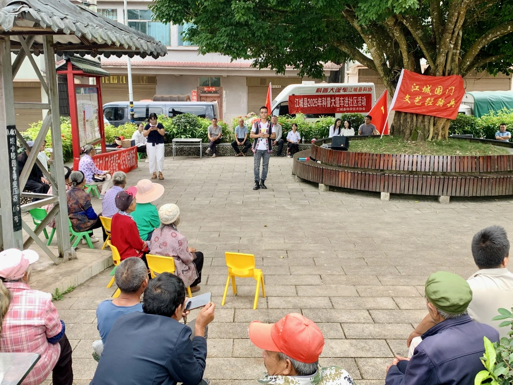 为让科学知识贴近生活、文化服务惠及群众,近日,江城县科学技术协会科普大篷车走进康平镇界碑村社区,并联合群团联盟、文工团开展节目演出慰问活动,为居民带来一场“知识+文化”的双重盛宴。
