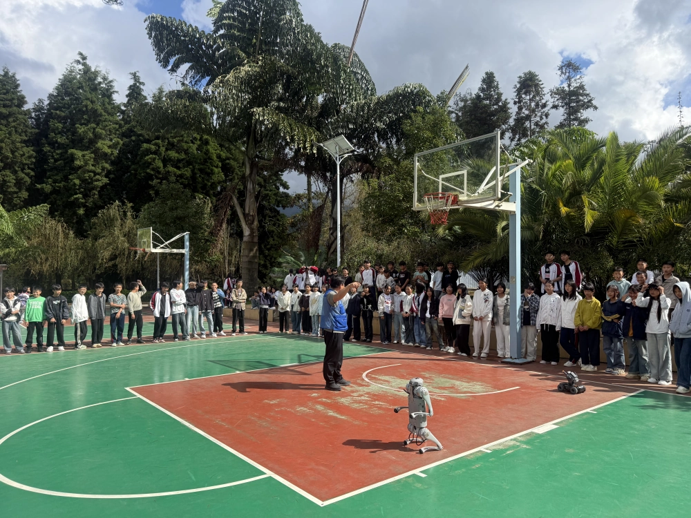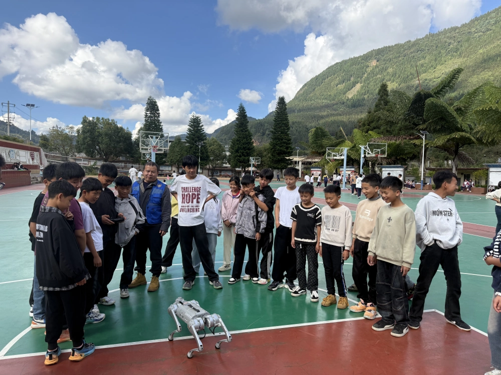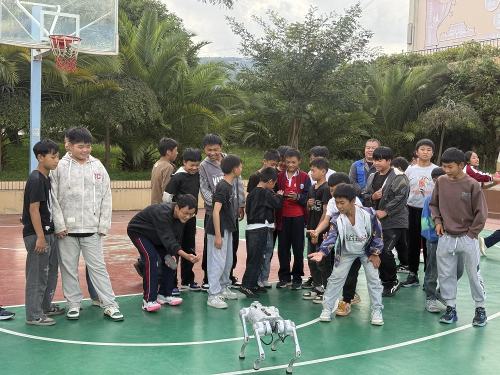 活动现场,科普大篷车变身“移动科技馆”,成为校园里最受欢迎的科普阵地。个旧市科协副主席李永祥亲自为同学们讲解各种科技设备的操作方法和应用场景,从无人机在航拍、救援、物流等领域的实际应用,到机器人技术的未来发展,深入浅出的讲解引发了学生们对科学技术的浓厚兴趣。在机甲大师对抗区,两台机器人灵活移动、精准射击,呈现了一场精彩的科技对决;机器狗表演区,机器狗完成奔跑、翻滚、拜年等仿人动作,引得学生们阵阵欢呼;无人机编队飞行表演更是将现场气氛推向高潮,多架无人机在空中变换队形,展现出科技与艺术的完美结合。
