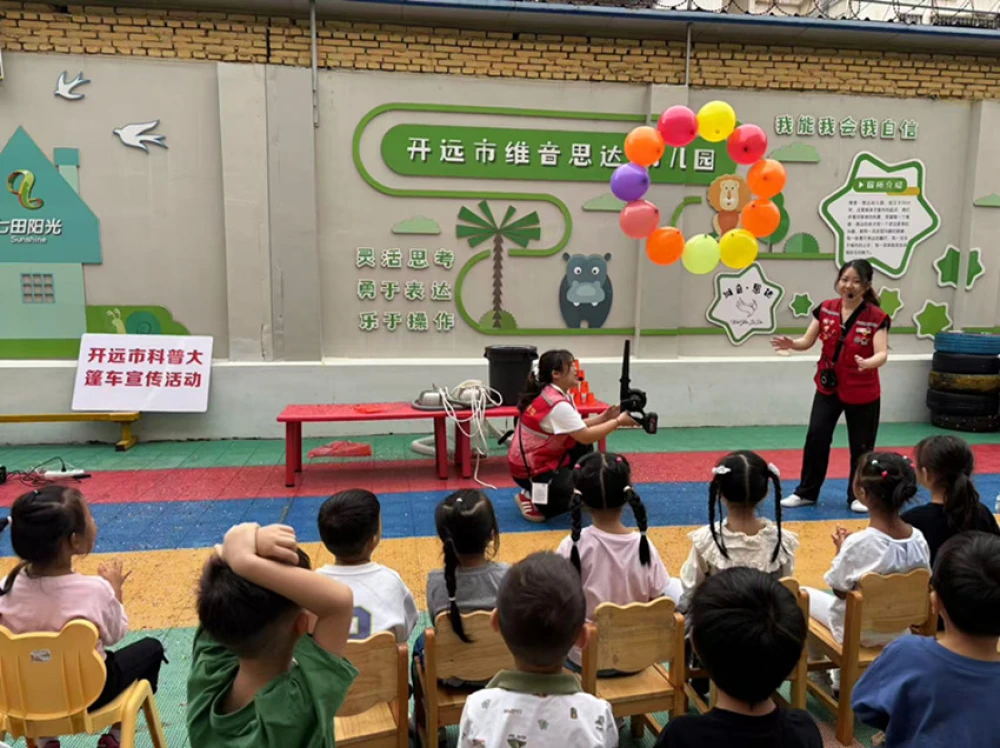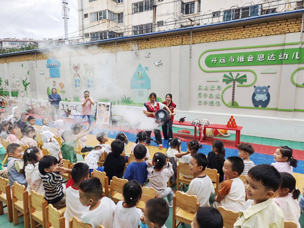 为进一步激发幼儿对科学的好奇心与探索欲,在孩子们心中播下科学的种子。10月16日上午,开远市科协的“科普大篷车”满载着有趣的科普展具,驶入开远市维音思达幼儿园,为全园1300余名师生带来了一场别开生面的“空气魔法秀”。