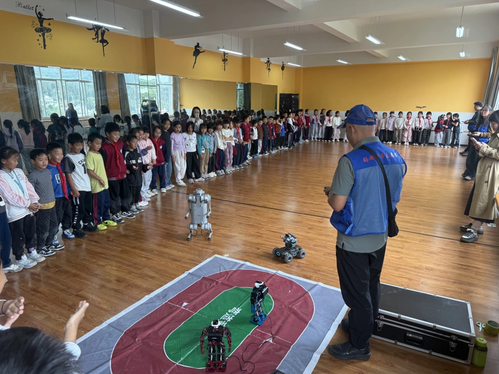 活动现场气氛热烈,科技魅力无处不在。备受瞩目的机甲大师灵活机动,展现了现代机器人技术的精密与智能;形态各异的机器人跟随着指令完成一系列复杂动作,引得同学们惊叹连连;仿生机器狗栩栩如生,其逼真的步态和快速反应能力引发了阵阵欢呼;无人机在操场上空自如翱翔、做出各种特技飞行动作,将现场氛围推向高潮。此次活动精心安排,分上午、下午两个时段,各班级按批次有序进行参观和操作体验,确保了每一位学生都能近距离感受科技的神奇。