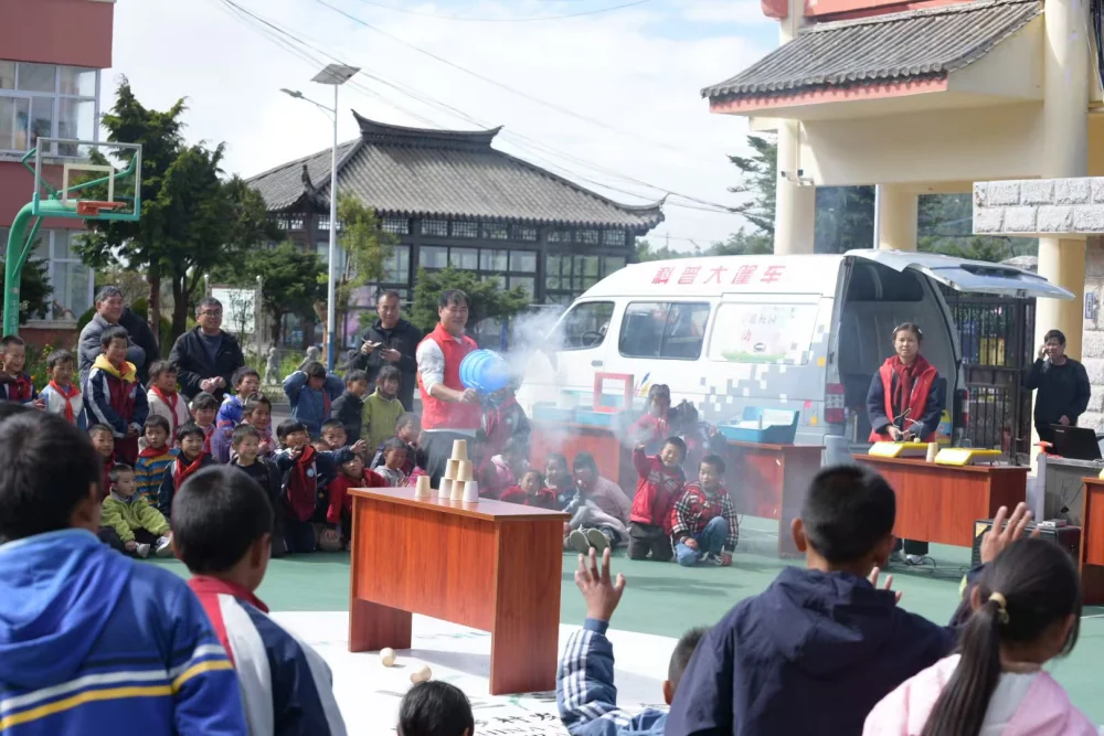 大海乡坐落于乌蒙山颠,大海小学海拔达3200多米,气候环境恶劣,学生学习条件艰苦。为让山区孩子感受科学魅力,10月24日上午,会泽县科协带着“科普大篷车”翻山而来,为这里的190余名师生送上一场沉浸式科普盛宴。