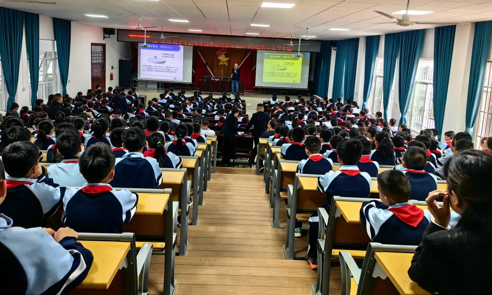 许木启教授以《水——生命的源泉》为题,结合缺水地区真实案例和水资源循环示意图,系统阐释水对生命的重要意义与污染危害。他现场演示简易净水小实验,传授淘米水浇花、缩短淋浴时间等实用节水技巧,互动问答中引导学生牢固树立节水护水的环保意识。