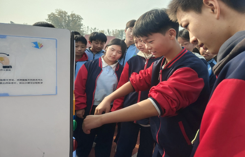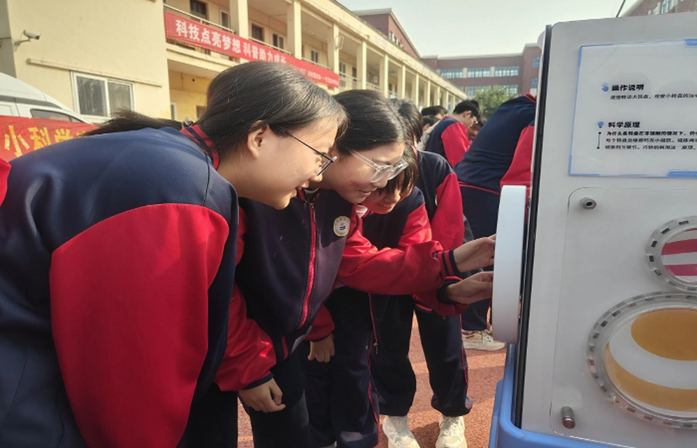 表演环节结束后,学生们兴致勃勃地涌入科普大篷车展区。车内陈列了数十件涵盖光学、力学、电磁学、数学等领域的互动展品。“锥体上滚”、“磁力转盘”、“看谁滚得快”、“窥视无穷”等设备前围满了好奇的学生。他们亲手操作,亲眼观察,在“玩”的过程中探究科学原理,解开心中谜团。这种沉浸式的体验,让课本上的知识“活”了起来,极大地激发了他们的探究欲和好奇心。