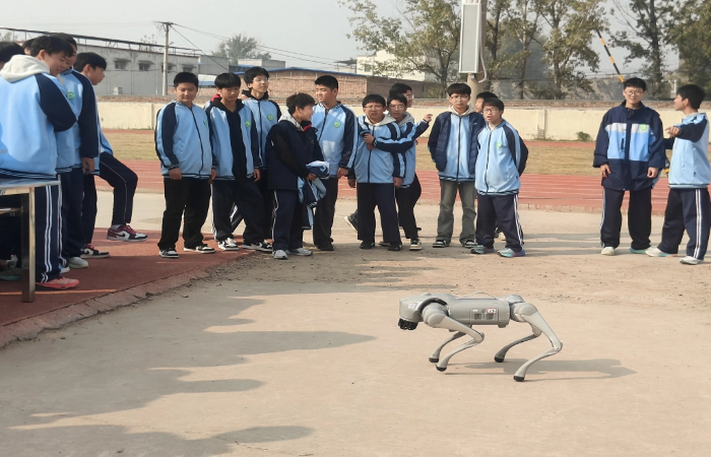 紧随其后的是本次活动的“明星”——四足机器狗表演。这款曾在诸多高科技场合亮相的智能机器人,灵活地在地上行走、奔跑、翻滚,甚至完成作揖、跳舞等高难度动作。它精准的步态控制和敏捷的反应能力,引得同学们阵阵喝彩。