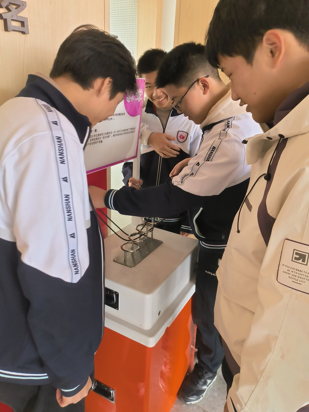 活动现场,科普大篷车化身为一座“移动的科技馆”,数十件涵盖物理、数学、电磁、光学等领域的互动展品整齐排列,瞬间点燃了同学们的好奇心与探索欲。学生们在老师的组织下,分批次、有秩序地参与到体验活动中。他们或围在“窥视无穷”设备前惊叹于科技带来的沉浸式体验,或在“无弦琴”、“动画”等展品前动手操作,亲身感受科学原理的神奇与奥妙。
