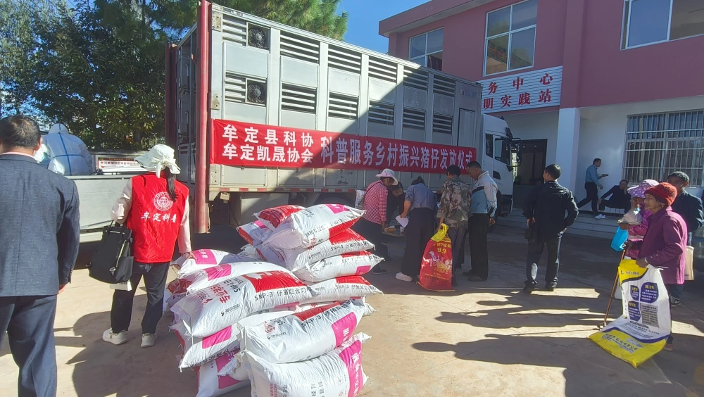 举行猪仔及饲料免费发放仪式: 作为“科普服务乡村振兴”的关键举措和直接惠农环节,活动现场隆重举行了发放仪式。在县科协的指导与支持下,凯晟协会向47户养殖户免费发放了47头优质猪仔,并配套发放了47袋猪仔饲料。这一精准帮扶举措,不仅显著减轻了农户的生产投入压力,更为猪仔前期的健康成长提供了保障,充分体现了科普惠农工作的细致入微,极大地调动了农户的养殖积极性。