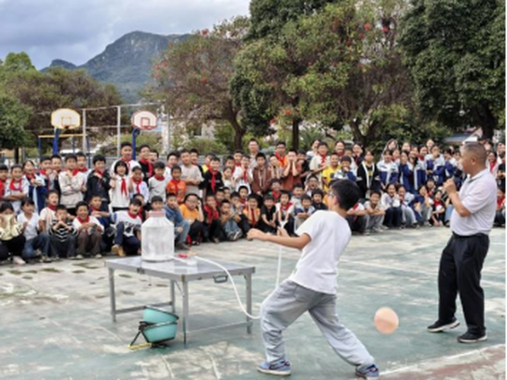 本次联合行动的紧密结合文山州作为边疆民族地区的实际,将科普资源精准投送至以往科普服务相对薄弱的民族地区和边境沿线。10月16日,科普志愿队伍深入丘北县的曰者镇中心小学,为学生们带来了一场充满趣味与启发的科技互动体验。操场上,灵活的机器人跟随着音乐节奏起舞,憨态可掬的机器狗展示着各种高难度动作,无人机在空中划出优美轨迹,智能遥控赛车进行着激烈的竞速表演,引得同学们惊叹连连,欢呼声此起彼伏。在科学实验环节,志愿者们通过马德保半球实验生动演示了大气压力的巨大力量;利用静电发生装置让同学们亲身感受静电的储存与瞬间释放带来的奇妙现象;精心设计的粉尘爆炸模拟实验,则深刻揭示了特定条件下粉尘燃烧爆炸的原理及其危险性,在确保安全的前提下极大地激发了同学们探索科学奥秘的好奇心。这些互动性极强的展演和实验,不仅让学生们近距离 接触了前沿科技,更在他们心中埋下了热爱科学、崇尚创新的种子。