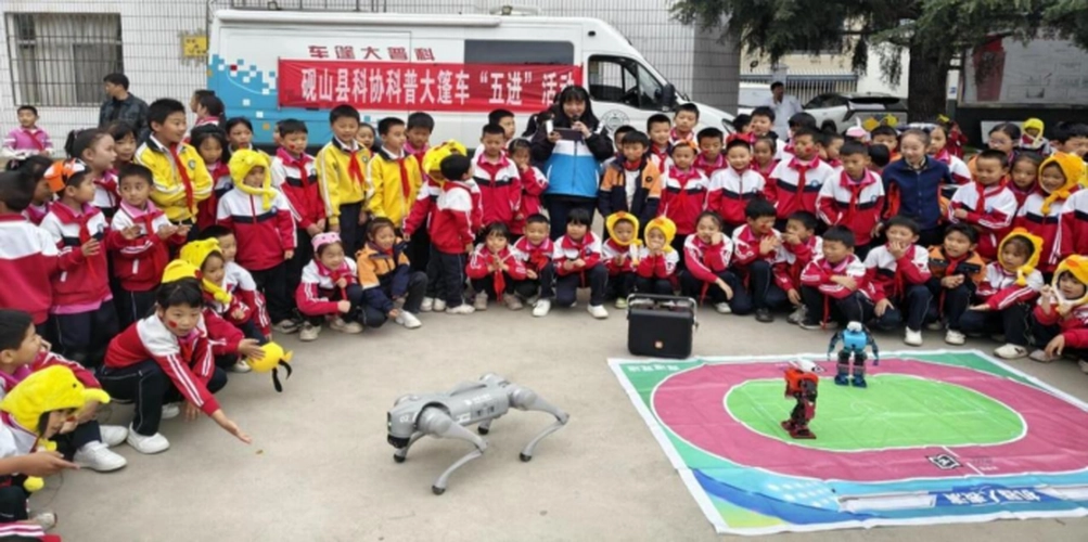 更为吸引学生们的是县科协带来的“科技萌宠”——智能机器人和灵活敏捷的机器狗。它们精准完成指令、进行互动表演,激发了孩子们对人工智能和机器人技术的无限好奇。同时,科普大篷车配备的各种涵盖光学、电磁学、力学等基础科学原理的展教设备也向学生们开放体验。同学们或围在展品前认真操作,或聚精会神地聆听讲解,在亲手实践和互动问答中,深刻感受到了科技的魅力与乐趣。
