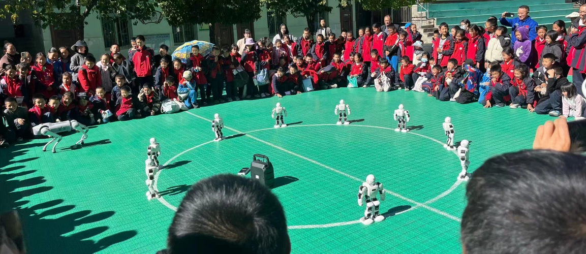 活动现场,科普大篷车变身“移动科技馆”,10余件涵盖声学、光学、力学、电磁学等领域的互动展品整齐陈列,“磁悬浮地球仪”“无弦琴”“拓扑解环”等趣味装置吸引学生们驻足探索。大家亲手操作、相互协作,在实践中感受“看不见的力”“声音的传播”等科学原理,时不时发出阵阵惊叹。仿生机器狗的精彩表演更是点燃全场气氛,随着音乐完成跳跃、打滚、鞠躬等动作,还能用亲切的方言回应学生问候,让孩子们在欢声笑语中触摸前沿科技的魅力。