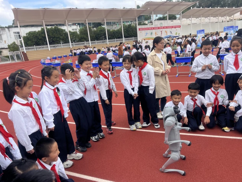 操场上,仿生机器人灵活模拟动物步态,在跑道上自如穿梭,引来孩子们阵阵欢呼。这些充满未来感的“黑科技”互动,悄悄在他们心中播下了人工智能与机械工程的种子。