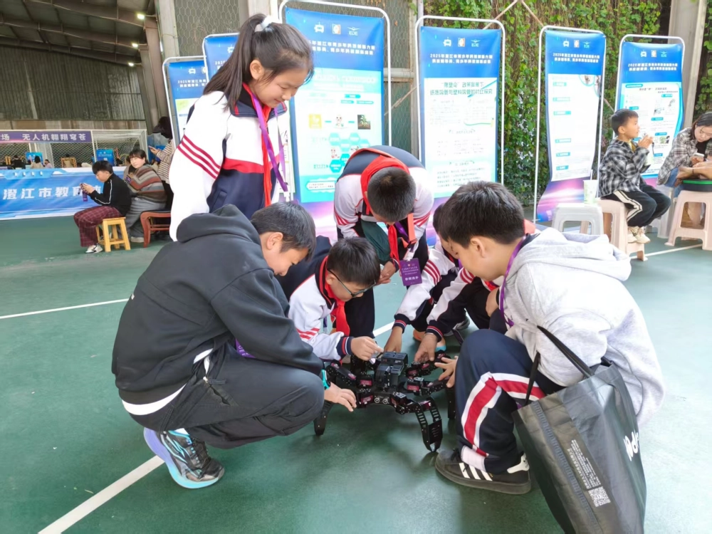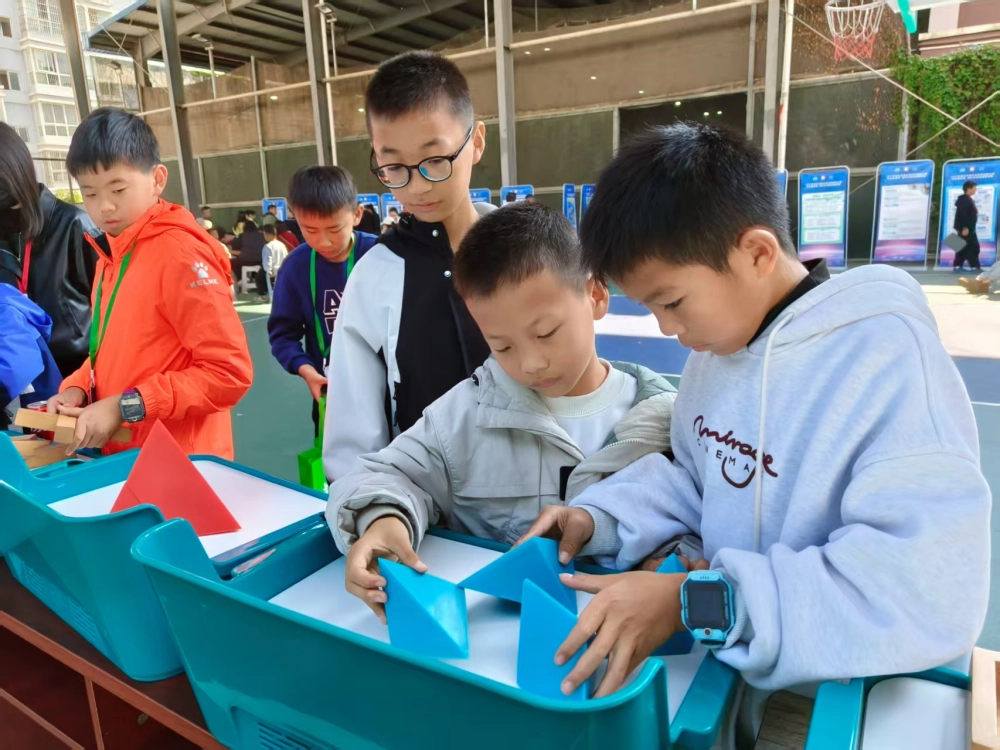 趣味科普体验区亮点十足,不仅延续了备受欢迎的“互动式科普”,体验内容更是全面升级: 这边“数学之趣”思维训练套装前,同学们忙着解锁数字迷宫、搭建立体几何模型,在动手闯关里玩转数学逻辑;那边六足蜘蛛仿生机器人、机甲大师早已列队就绪,孩子们热情高涨,操控机器蜘蛛模拟仿生爬行,和机甲大师来一场趣味对战,科技感直接拉满!