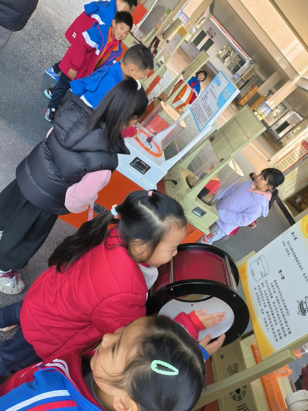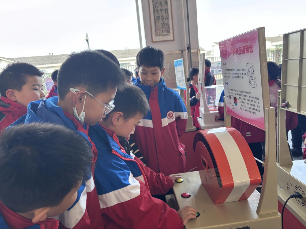 活动期间,平日里书声琅琅的校园化身为一座流动的科技馆。“动画”、“无弦琴”、“吹不走的小球”、“尖端放电”等涵盖声、光、电、力、磁等多学科的16件互动展品整齐排列,瞬间成为了校园里最受欢迎的“打卡点”。学生们以班级为单位,在老师的带领下有序参观体验。