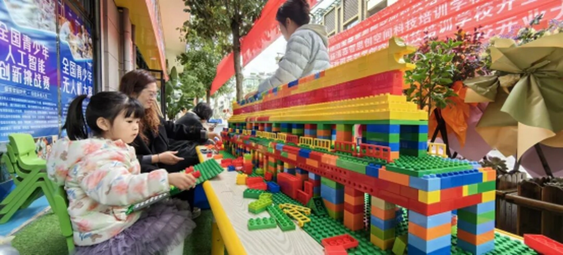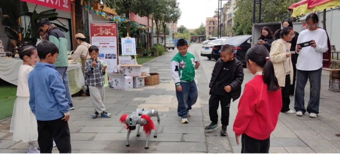 “科技天团”闪亮登场。机器狗随着音乐起舞,憨态可掬,萌翻全场;无人机编队腾空而起,在空中拼出“未来”二字,引来孩子们阵阵欢呼。机器人舞蹈、乐高遥控闯关、图形化编程体验等六大互动体验区前排起长队,每完成一项任务即可获得科普印章,集齐后还可兑换“惊喜盲盒”。