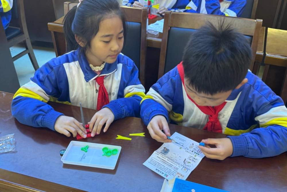 活动现场,工作人员为同学们准备30套风力风向器实验套装核心部件及组装指南。在工作人员的引导下,同学们先仔细观察各部件的结构与功能,了解风向标对风向的指示作用、指南针的指向原理。随后,同学们分组协作,从固定支架、安装风向标,到拼接扇叶、调试测量部件,每一个步骤都考验着大家的耐心与协作能力。同学们相互配合、互帮互助。有的同学认真比对说明书,调整仪器角度,还有的同学提前畅想成品完成后,测试户外风力的场景。