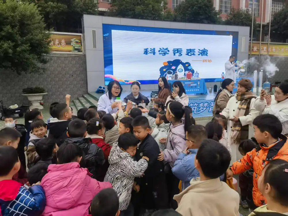 科学秀环节更是惊喜连连。科普老师化身“魔法师”,借助“液氮蘑菇云”等趣味实验,将书本上的原理变成了直观的奇妙现象。同学们在欢声笑语中争先恐后地举手互动——正是在这热烈的氛围里,那些深奥的科学知识,悄然化为了他们眼中闪亮的光。