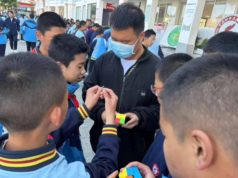 活动现场处处洋溢着欢乐与求知的气息。科普工作人员摆放出鲁班锁、九连环、魔方等传统益智教具,还带来了机器狗演示等趣味项目。同学们纷纷围拢在桌前,有的专注拆解九连环,手指翻飞间摸索规律;有的合力拼装鲁班锁,在反复尝试中解锁几何拼接的奥秘;遇到困惑时,科普工作人员便耐心讲解原理,手把手指导技巧。