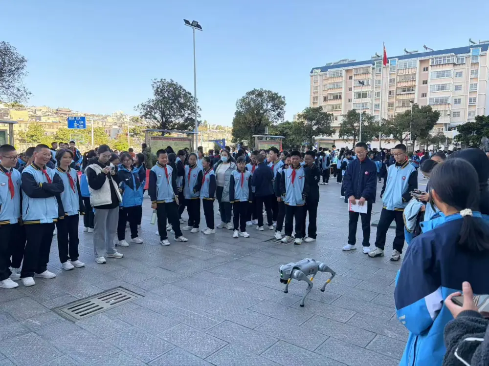 广场上,机器狗完成系列特技动作,引得同学们驻足围观、连连惊叹。