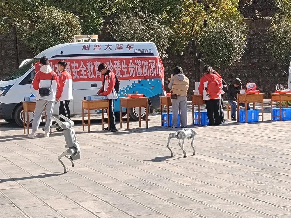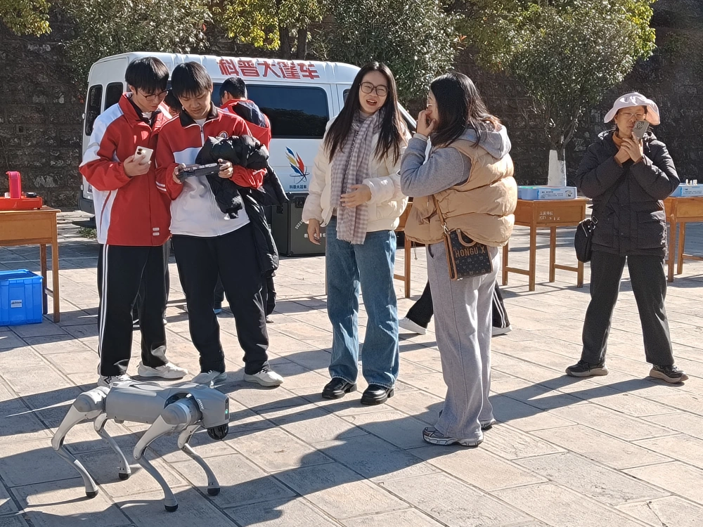 通海县科普大篷车展出:车载科普展教具23件。其中,新增科学仪器“宇宙中的地球、豌豆的旅行记、热导流实验、能量转换实验、针孔成像实验”五组,智能机器狗1套。科普器具集数理化、地理生物等多学科知识为一体,益智与趣味并存,各年级的学生们三五成群来到科学展具前动手操作、快乐体验。在共振鼓、人体发电、猜属相、魔镜、魔具、时光隧道、袋鼠下坡等器具前触摸体验。许多同学在科普员指导下,争先恐后亲自操控机器狗,发出指令做各种动作,机器狗握手、空翻、攀爬、倒立、伸腰、跳跃、跳舞等姿态引得同学们欢声笑语。人机互动中打开了眼界,增长了见识。