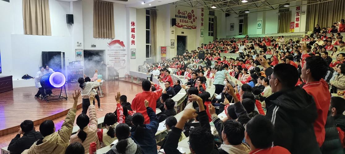 晚上,学生会堂内,科学秀表演更是点燃全场热情。楚雄州科技馆的科普辅导员接连上演精彩项目:马德堡半球让学生亲身感受大气压的威力,大炮烟圈、乒乓球喷射展现流体力学的奇妙,火焰掌燃起火焰却不伤皮肤,液氮大爆炸的瞬间让学生惊呼不已。每个项目现场还邀请多名学生上台参与互动,亲身操作实验,台上台下互动频繁,气氛热烈非凡。