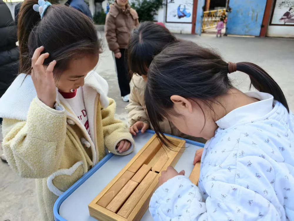 12月3日,大寨镇小寨村小学现场,孩子们聚精会神组装益智游戏,感叹着VR眼镜里面的海洋世界,太空飞行、桃花源诗词的神奇,与机器狗互动。