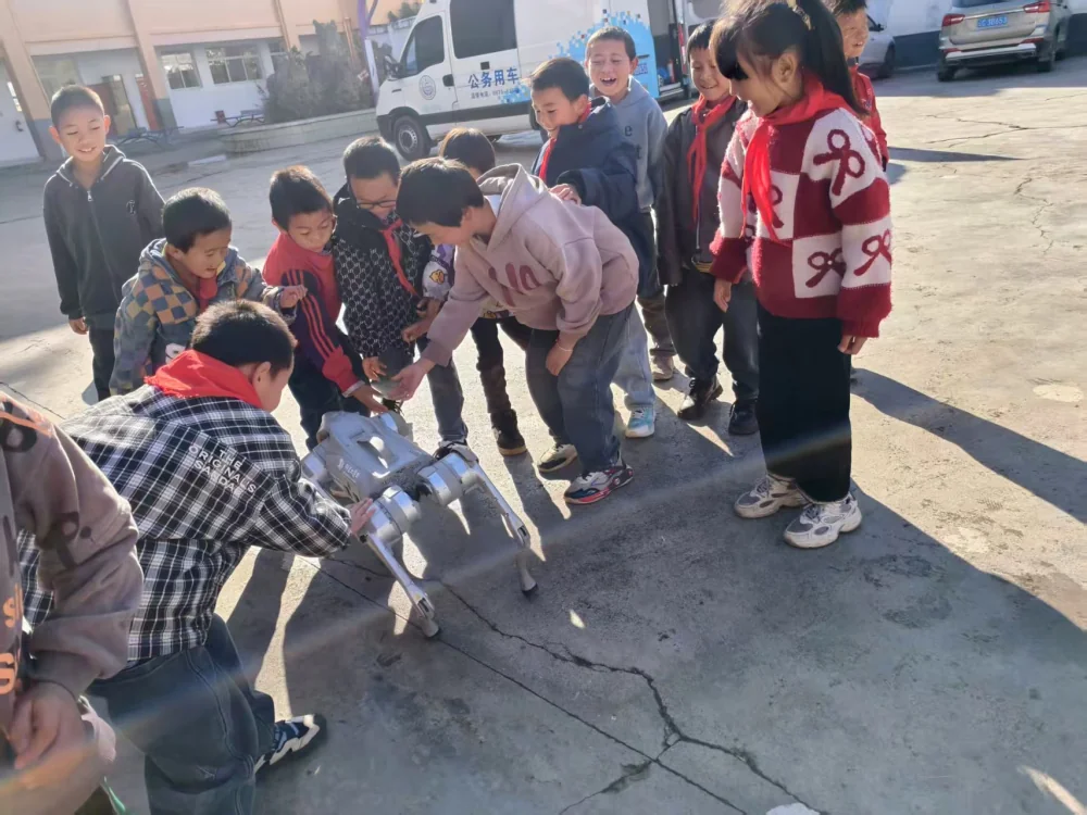 12月4日,炉房乡鸡噜小学,在好奇心的驱使下,孩子们试着跟机器狗拉手,小心的用手去触摸机器狗,跟着机器狗赛跑。望着各种科普器材,孩子们感受着科技带来的魅力。