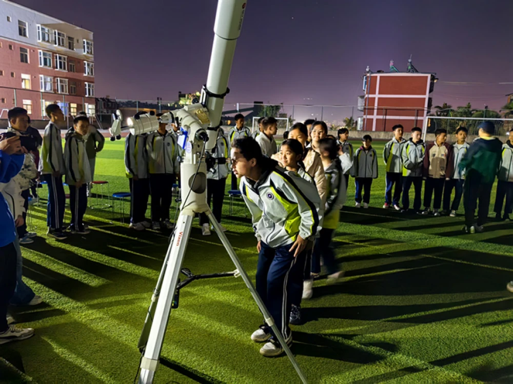 夜幕降临,操场化身为露天“星空课堂”。专业天文望远镜指指月球和土星,学生们排队轮流观测,生怕错过任何细节。这场天文科普活动不仅是知识的传递,更是无数双望向宇宙的眼镜,在同学们心中悄悄种下了探索的种子。