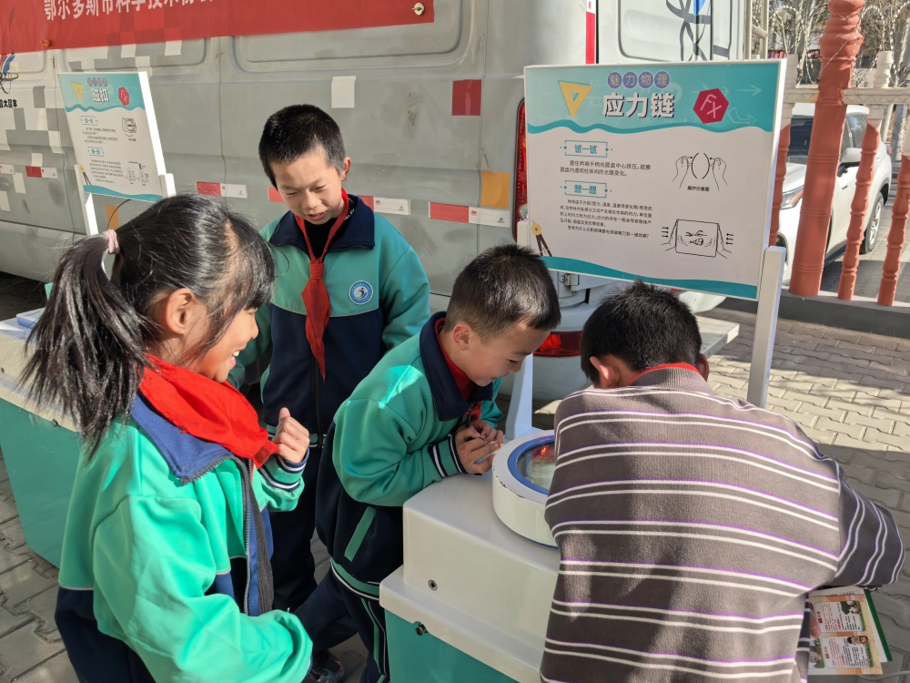 12月4日,鄂尔多斯科技馆科普大篷车携自有IP“百嘎丽”走进达拉特旗,前往昭君镇中心小学,,以“移动科普课堂”的形式,为孩子们带来一场集趣味与知识于一体的科学体验。没有固定教室与讲台,科普大篷车本身就是一座“移动科技站”。车门开启,仿佛打开了通往未来的窗口。学生们通过VR眼镜沉浸式遨游深海与星空,在操作机器狗的过程中感受人工智能就在身边,从角反射器的光线回返里窥见物理规律,也在齿轮音乐台上听见力学与旋律的巧妙结合。