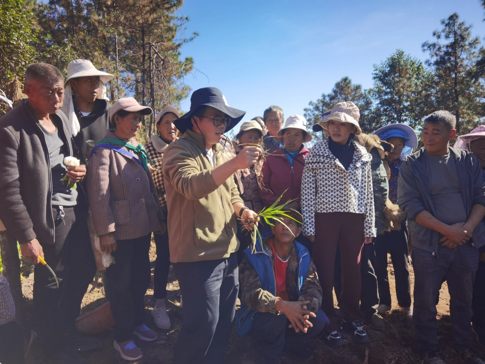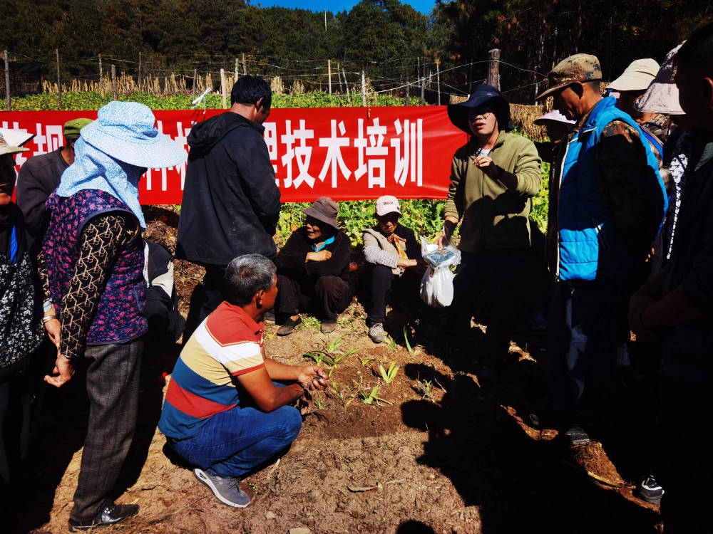 培训特邀云南省农业科学院药用植物研究所胡明举老师到场主讲。胡老师系统讲解了白芨的优良品种特性、显著药用价值及当前市场前景,结合当地气候条件和土壤特性,就选地要求、品种选择、基肥制备、种苗保管、科学施肥、病虫害绿色防控及综合田间管理等后续管护要点等内容进行了详细说明,并现场示范操作起垄、开沟、置苗、覆土等标准化栽植流程。针对种植户在实际生产中遇到的种苗成活率低、施肥不当、病害防治难等问题,提供了具有针对性的指导。