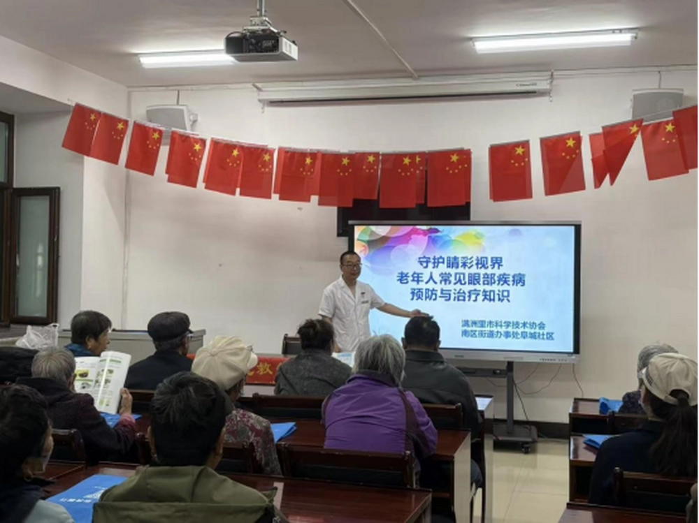 在全国首个科普月活动期间,满洲里市科协组织了一系列贴近民生的科普活动,深入社区为居民带来知识与服务。本次活动特邀满洲里市人民医院具有丰富临床经验的医疗专家,为社区老年人系统讲解了白内障、青光眼、黄斑病变等常见眼部疾病的成因、预防措施及治疗方法。专家通过通俗易懂的语言和实际案例,帮助大家增强爱眼护眼意识,科学应对眼部健康问题。