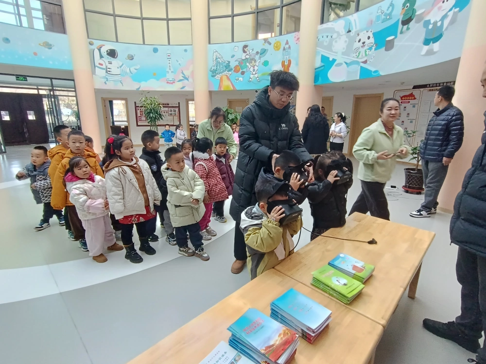 活动现场,土默特左旗科协工作人员结合幼儿认知特点,精心准备了涵盖自然科学、民族团结常识的科普手册,手册以生动图文讲解简单科学原理,穿插各民族友好相处的小故事,让孩子们在阅读中既学知识,又懂团结。最受小朋友欢迎的是VR 眼镜体验环节,在工作人员的指导下,孩子们有序排队,戴上VR眼镜“走进”奇妙的科学世界,探索宇宙奥秘、动植物生长等场景,沉浸式体验激发了强烈的好奇心与探索欲,现场欢声笑语不断。
